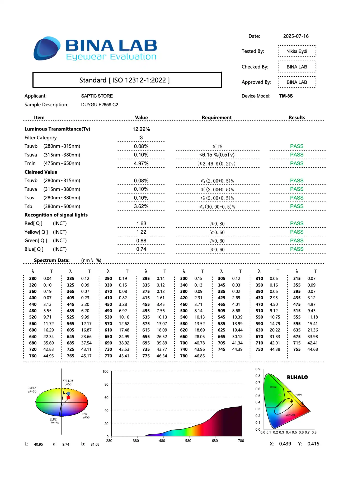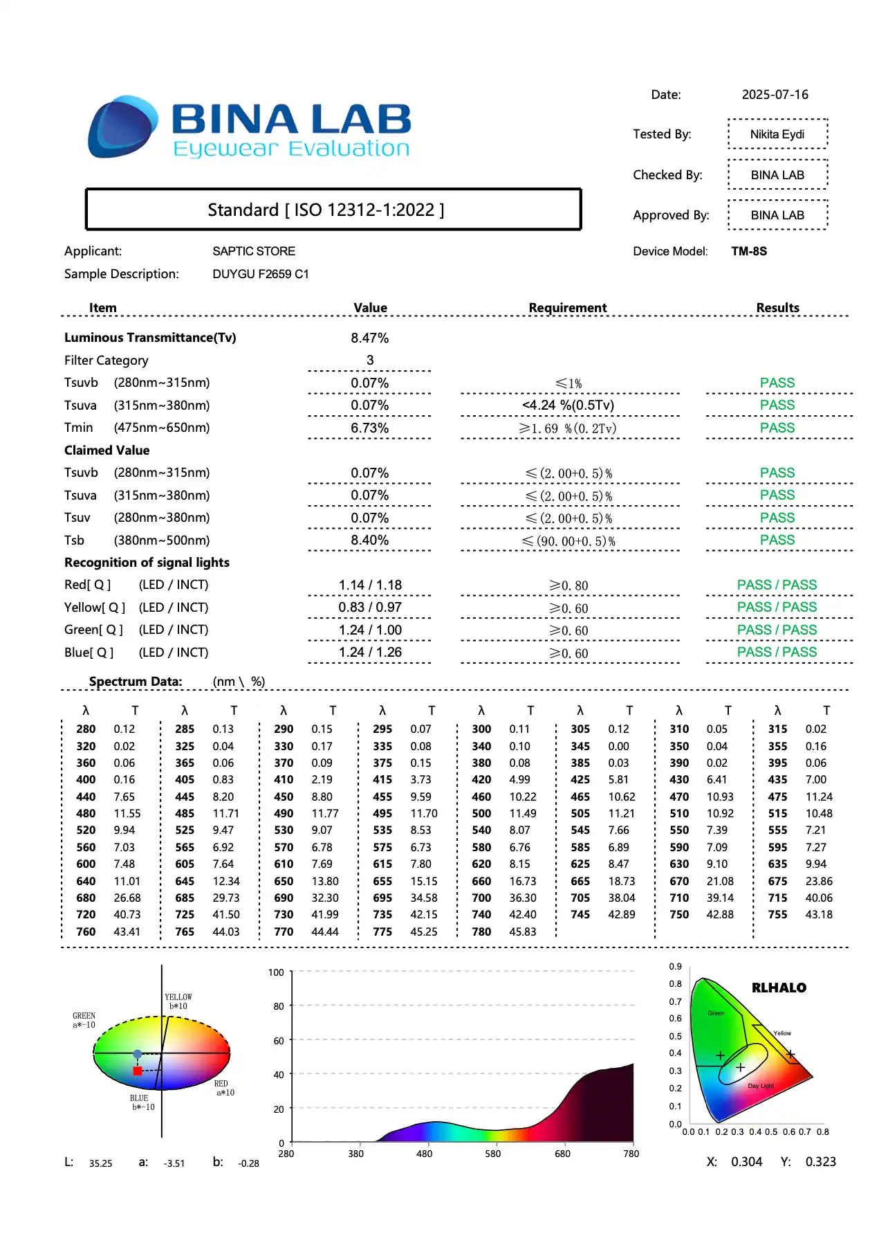 • لنز (Lens): لنزها از جنس پلی‌کربنات (Polycarbonate) یا پلاستیک فشرده با کیفیت هستند که دارای محافظت در برابر اشعه فرابنفش خورشید (UV Protection) می‌باشند. رنگ لنزها متناسب با رنگ فریم تیره شده است تا علاوه بر زیبایی، وضوح دید مناسبی را فراهم کند.