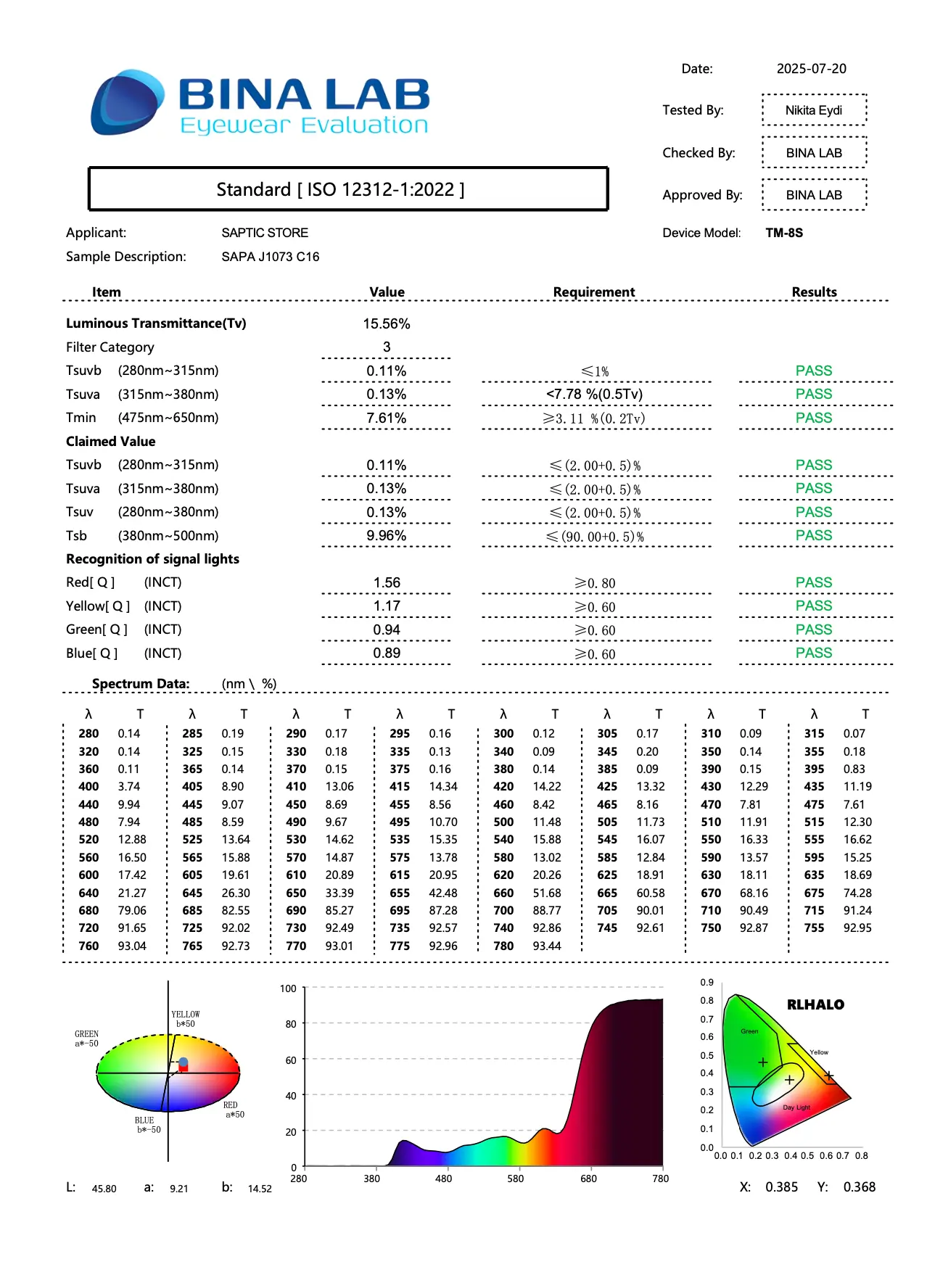 این گزارش به تشریح ویژگیهای کلیدی عدسیها میپردازد، از جمله میزان عبور نور مرئی (Tv) که مقدار کلی نور قابل مشاهده عبوری را اندازهگیری کرده و «دسته فیلتر» (Filter Category) آن را (یعنی میزان تیرگی عدسی) مشخص میکند. همچنین، این گزارش اطلاعات ایمنی حیاتی در مورد میزان جلوگیری از عبور اشعههای مضر فرابنفش (UVA و UVB) را ارائه میدهد. علاوه بر این، گزارش ارزیابی میکند که آیا رنگ عدسی در تشخیص رنگهای ضروری، مانند چراغهای راهنمایی، اختلال ایجاد میکند یا خیر تا ایمنی کاربر تضمین شود. در اصل، این گزارش به منزله یک تأییدیه رسمی عمل میکند که نشان میدهد عینک مورد نظر، پیش از عرضه به مصرفکنندگان، با استانداردها و معیارهای کیفی و ایمنی تعیینشده مطابقت دارد.