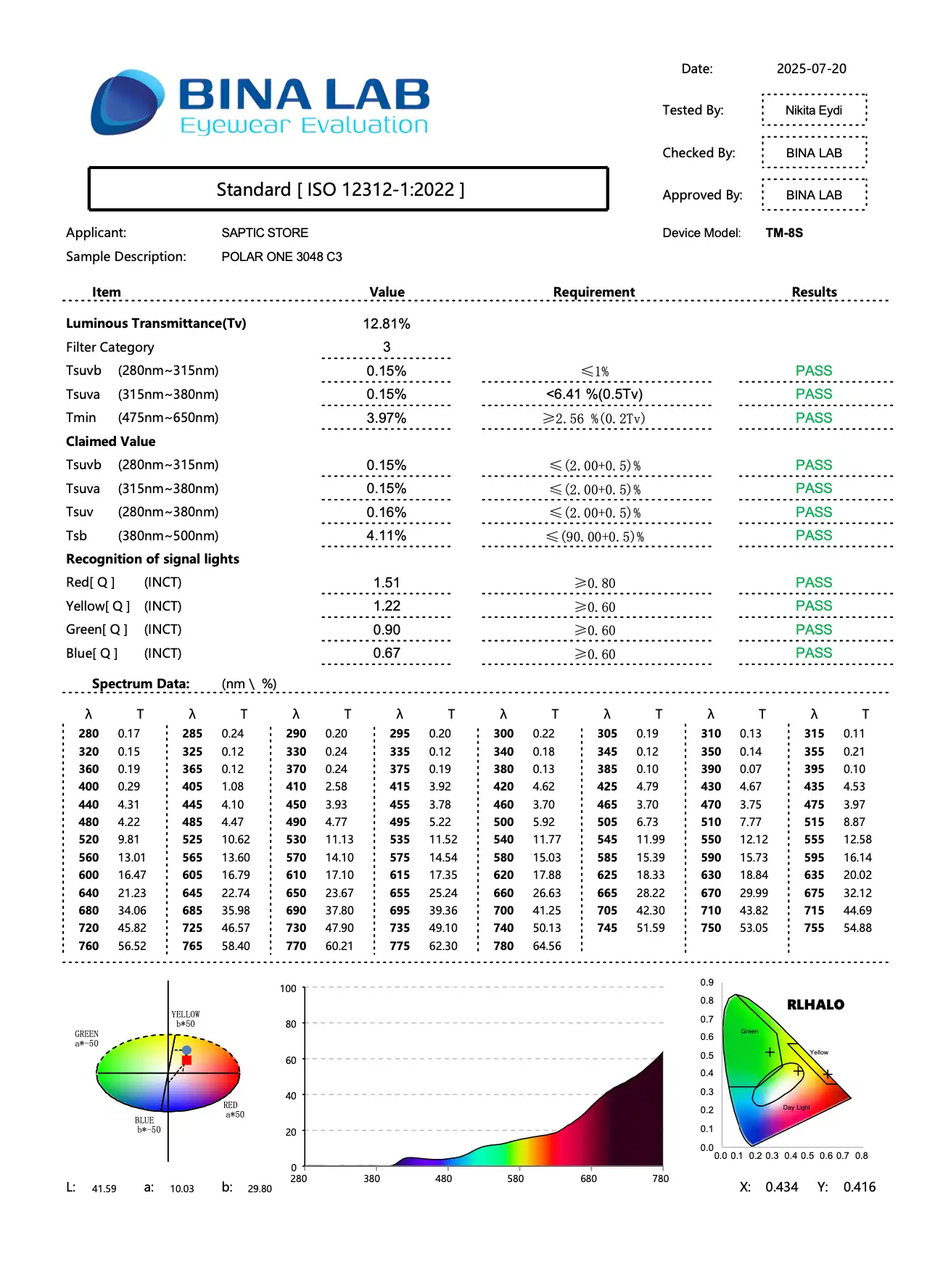 این گزارش به تشریح ویژگیهای کلیدی عدسیها میپردازد، از جمله میزان عبور نور مرئی (Tv) که مقدار کلی نور قابل مشاهده عبوری را اندازهگیری کرده و «دسته فیلتر» (Filter Category) آن را (یعنی میزان تیرگی عدسی) مشخص میکند. همچنین، این گزارش اطلاعات ایمنی حیاتی در مورد میزان جلوگیری از عبور اشعههای مضر فرابنفش (UVA و UVB) را ارائه میدهد. علاوه بر این، گزارش ارزیابی میکند که آیا رنگ عدسی در تشخیص رنگهای ضروری، مانند چراغهای راهنمایی، اختلال ایجاد میکند یا خیر تا ایمنی کاربر تضمین شود. در اصل، این گزارش به منزله یک تأییدیه رسمی عمل میکند که نشان میدهد عینک مورد نظر، پیش از عرضه به مصرفکنندگان، با استانداردها و معیارهای کیفی و ایمنی تعیینشده مطابقت دارد.